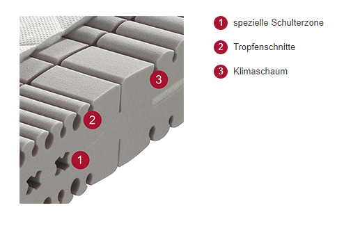 - Der in der Beckenzone integrierte Klimaschaum sorgt für eine ergonomisch ideale Lagerung der Wirbelsäule in diesem Bereich und fördert zusätzlich die Durchlüftung.