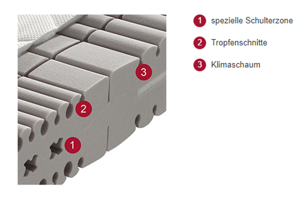- Der offenporige, klimaaktive 7-Zonen-EMC-Kaltschaum gewährleistet punktelastischen Liegekomfort.